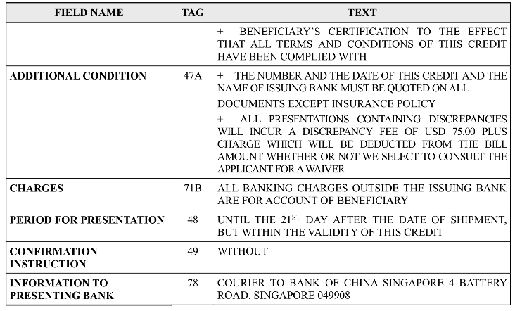 Traditionally,a letter of credit was transmitted by airmail,telegraph or telex,but beginning in 1973,with the creation of SWIFT(Society for Worldwide Interbank Financial Telecommunication),banks began to migrate to electronic data interchange as a means for controlling cost.SWIFT has made two important contributions in this endeavor:Firstly,it builds up a secure platform on which financial institutions can communicate with each other in a reliable and efficient manner.It is widely used for sending a wire transfer,issuing a letter of credit,advising a discrepancy,etc.Secondly,it establishes standard and secure message formats for communication.Each message type has a particular code,called a SWIFT message type.For example,MT 700 is the code for issuing a documentary credit and MT 707 for amending a credit(MT means Message Type).Today,the vast majority of documentary credits are issued in electronic form via SWIFT,making “paperless”credits a standard in the industry.Table 11-1 below is a credit transmitted through SWIFT codes.