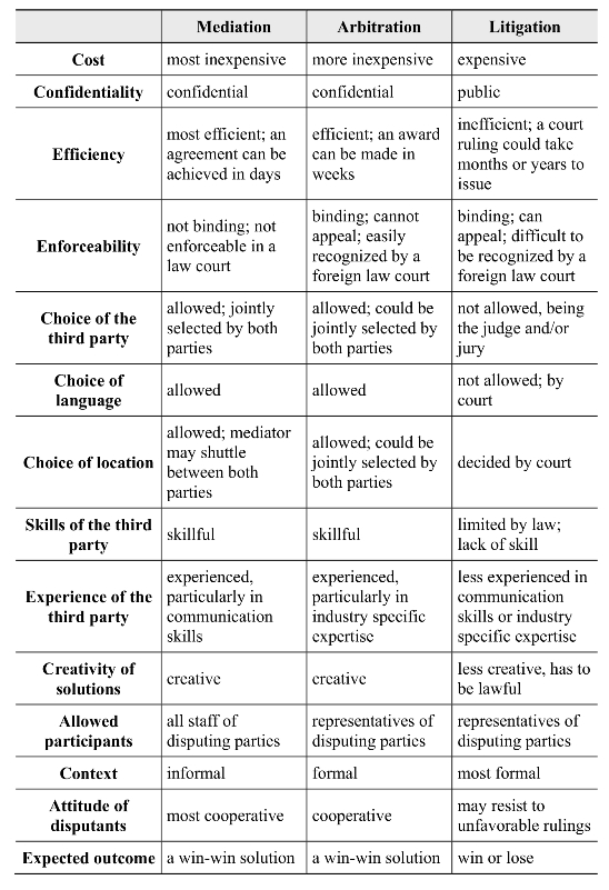 Table 12-1 A Comparison of Mediation,Arbitration and Litigation