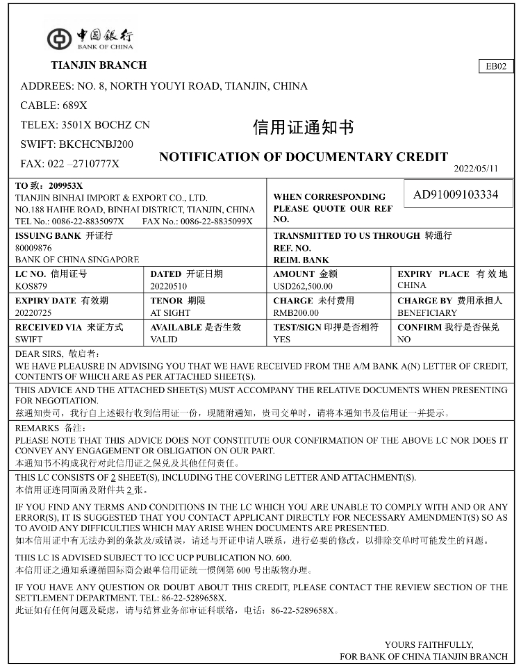 13.1.2.2 Advice of a letter of credit and a letter of credit信用证通知书和信用证