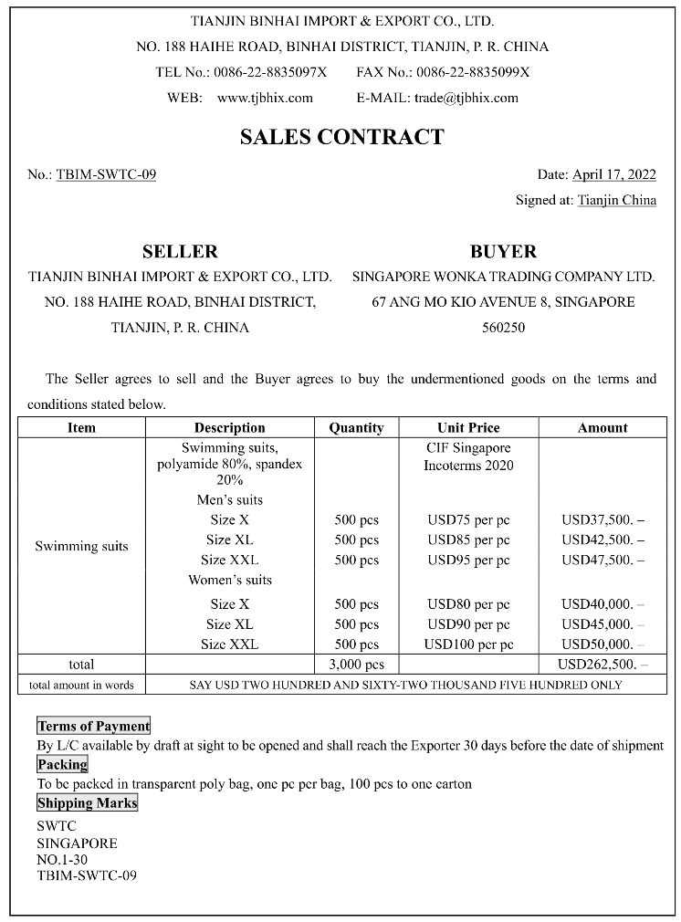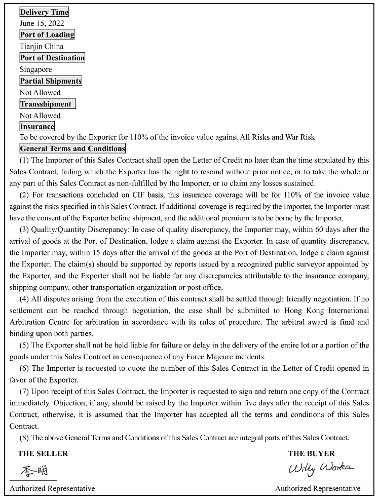 Figure 13-1 A Sample Export Sales Contract