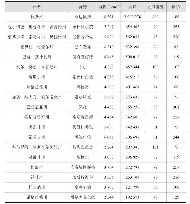 匈牙利全国划分为首都和19个州,设立24个州级市、274个市、2 854个乡。各州基本信息见表 1 - 1。首都布达佩斯是全国的政治、经济、文化和科技中心。其他主要城市有德布勒森、塞格德、米什科尔茨、佩奇、久尔等。德布勒森曾两次成为国家的临时首都,是发展最快的城市之一。