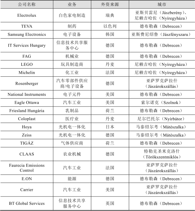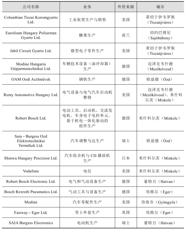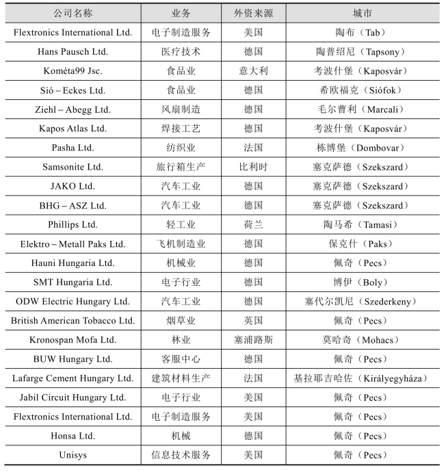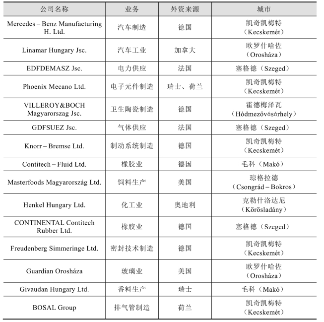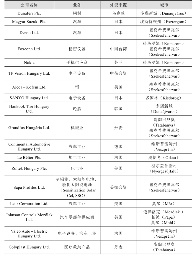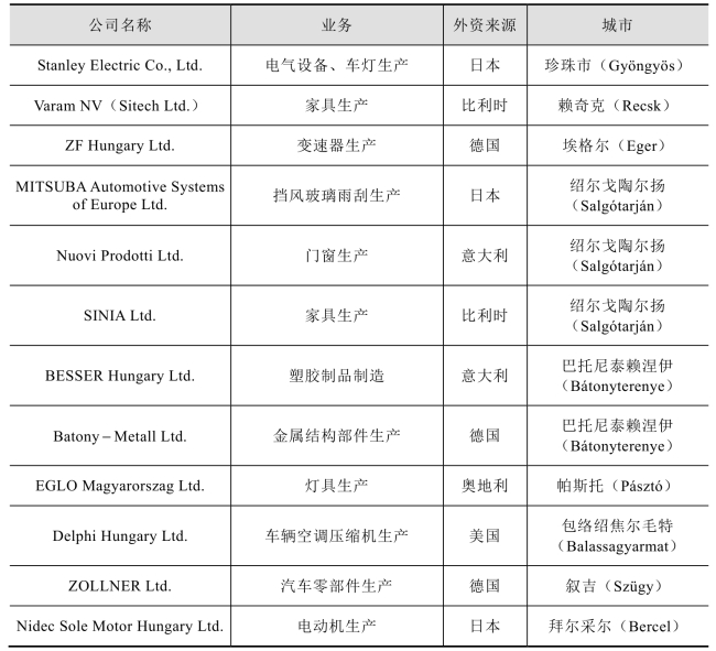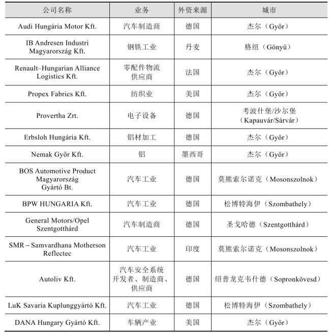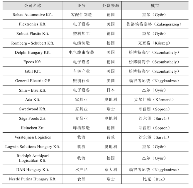 西多瑙河外大区由杰尔—莫松—肖普朗州、沃什州、佐洛州组成,是匈牙利境内 GDP 贡献第二高的大区。该大区与奥地利、斯洛文尼亚、克罗地亚和斯洛伐克4国接壤,地理位置优越,拥有2条高速公路,且是东西铁路枢纽,物流运输便利。区域经济增长以外资企业出口导向型生产为主要驱动力,吸引外国直接投资潜力仅次于布达佩斯和中多瑙河外大区。奥迪、欧宝等众多汽车制造商和汽配制造商在此投资设厂(见表1 - 4)。