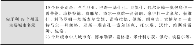 匈牙利19个州及主要城市名录如表1 - 8所示,首都布达佩斯是全国的政治、经济、文化和科技中心。其他主要城市有德布勒森、塞格德、米什科尔茨、佩奇、埃格尔等。德布勒森曾两次成为国家的临时首都,也是目前发展最快的城市之一。
