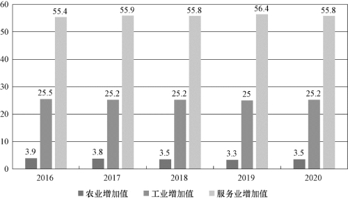 图1-2 2016—2020年匈牙利第一、二、三产业占GDP比重