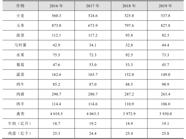表1-11 2016—2019年主要农、畜产品产量(单位:万吨;农畜类:万只或万头)