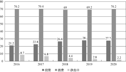 图1-3 2016—2020年匈牙利投资、消费和净出口占GDP比重