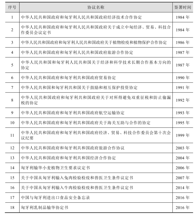 中匈自 1949 年建交以来,一直注重维护两国传统友好关系。两国领导人频繁互访,各领域合作不断加强,两国人民交流密切,双方在国际事务中相互支持、密切配合,这为双方经贸合作创造了良好的政治基础。1984 年,中匈经济、贸易、科技合作委员会成立,双方签署了《中华人民共和国政府和匈牙利人民共和国政府经济技术合作协定》《中华人民共和国政府和匈牙利人民共和国政府关于成立中匈经济、贸易、科技合作委员会议定书》两项基础性的协议,为促进处于市场经济发展初期的两国经济技术发展和双方后续经贸往来开辟了道路。随后三年,两国又逐一签署了《中华人民共和国政府和匈牙利人民共和国政府关于植物检疫和植物保护合作协定》《中华人民共和国政府和匈牙利人民共和国政府旅游合作协定》《中华人民共和国和匈牙利人民共和国关于经济和科学技术长期合作基本方向的协定》等协定。协定内容涵盖农作物检疫、旅游合作、经济和科学技术合作等方面,为进一步开展经贸往来做好了准备。1990 年,中匈签署了《中华人民共和国政府和匈牙利共和国政府贸易协定》,协定规定匈牙利给予中国最惠国待遇,这标志着中匈双边贸易的新开端。随着中匈双方贸易往来的不断升温,双方在实践中又分别签订了不少旨在促进双方经贸合作的协定。例如,《中华人民共和国和匈牙利共和国关于鼓励和相互保护投资协定》《中华人民共和国政府和匈牙利共和国政府关于对所得避免双重征税和防止偷漏税的协定》《中华人民共和国政府和匈牙利共和国政府关于海关互助与合作的协定》等。这一系列双边协定的签署,使得中匈双边贸易合作更加规范化、制度化。