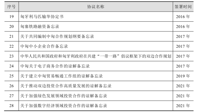 2021年11月18日,中国商务部部长王文涛和匈牙利创新与技术部部长鲍尔科维奇签署《中华人民共和国商务部和匈牙利创新与技术部关于推动绿色发展领域投资合作的谅解备忘录》《中华人民共和国商务部和匈牙利创新与技术部关于加强数字经济领域投资合作的谅解备忘录》。谅解备忘录的签署,将进一步加强中匈在绿色发展、数字经济领域的投资合作,促进两国投资合作高质量发展,深化双边经贸关系。中国与匈牙利经贸协议,具体可见表3 - 7。
