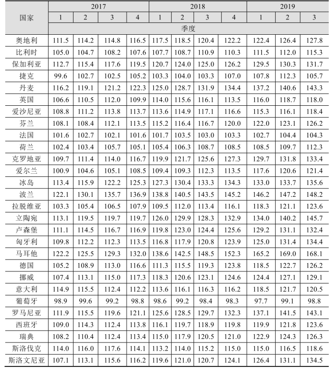 表4-9 欧洲各个国家的季度名义住房价格指数(2015=100.0)