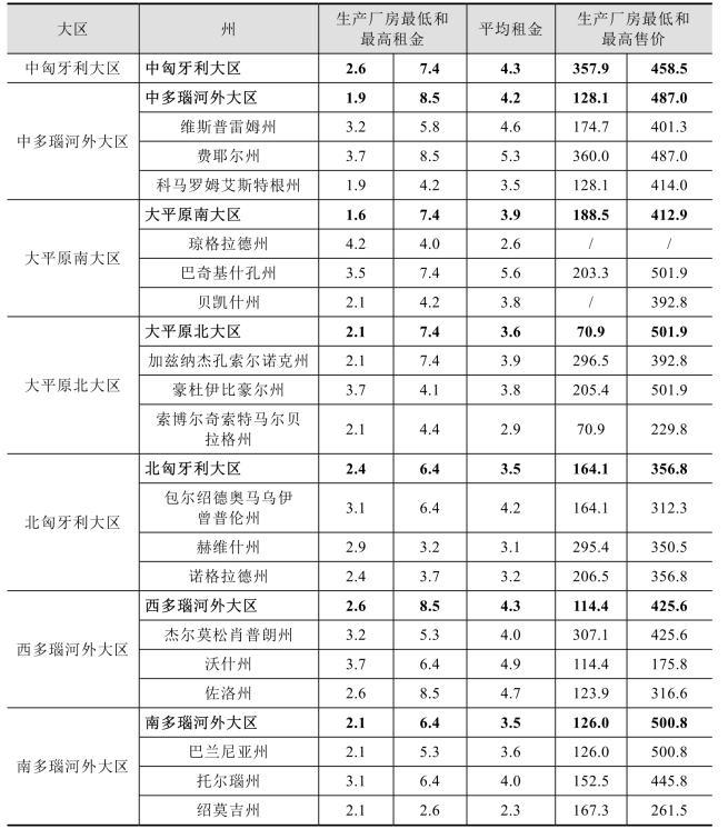 生产厂房售价与租金取决于地盘的条件(如公用事业设施和所处地段等)。匈牙利年生产厂房平均租金见表4 - 11。