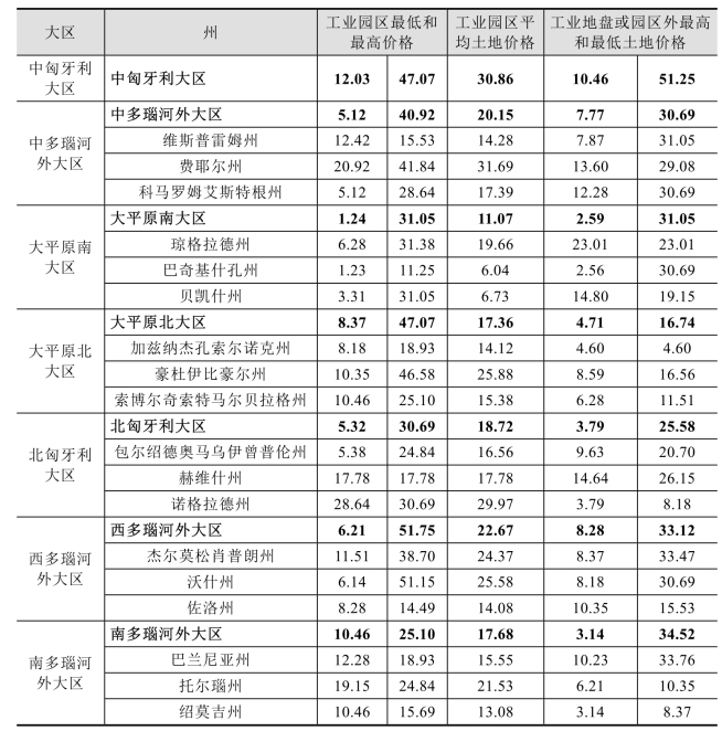 匈牙利工业地产主要集中在大布达佩斯地区(布达佩斯市中心周边30千米范围内)。布达佩斯办公楼平均租金24欧元/平方米/月,管理费(含能源费)4欧元/平方米/月。布达佩斯地区仓库(物流园、工业园)平均房租4.3~4.5欧元/平方米/月,管理费0.7欧元/平方米/月,月物业费为租金的8%,开发商要求的租赁期限通常为3~5年。首都以外其他地区,租金水平根据项目情况浮动较大。土地价格取决于地盘的条件(如公用事业设施和所处地段等)。具体工业用地价格见表4 - 10。
