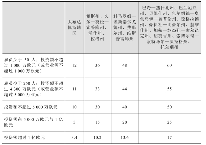 匈牙利根据欧盟规定,确定了不同规模企业在匈牙利不同地区投资,政府支持资金占投资总额的比例上限(见表4 - 14)。