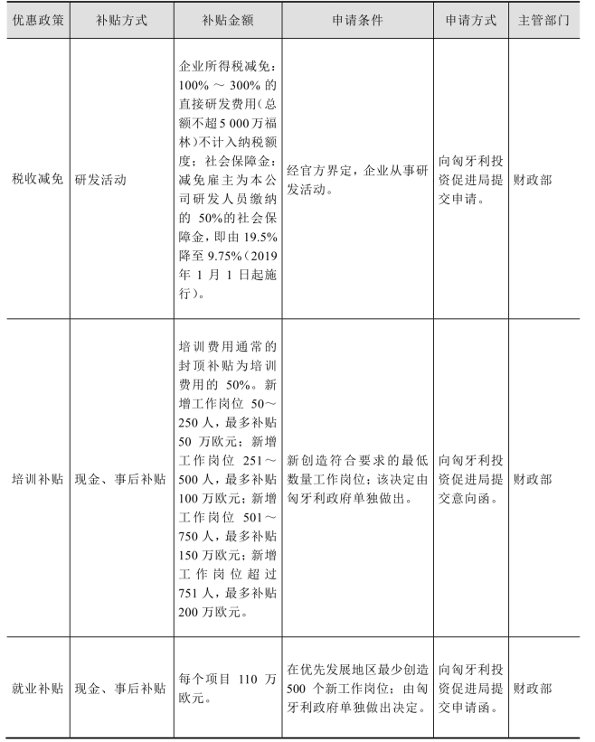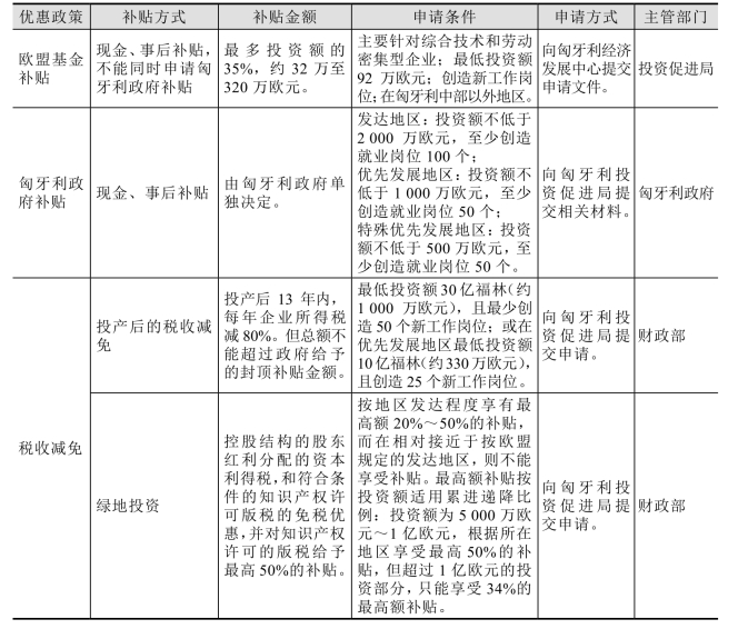 匈牙利的优惠政策主要有5种:欧盟基金支持、匈牙利政府补贴、税收减免、培训补贴和就业补贴。具体内容见表4 - 13。