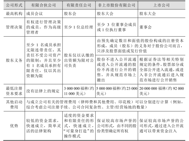 设立人仅可以设立符合民法典规定的商业组织。当前民法典下可设立的组织形式有:有限责任公司、非上市股份有限公司、上市公司、普通合伙和有限合伙(2006年1月1日起不可再设立合资公司)。最重要的合伙企业形式见表4 - 25。