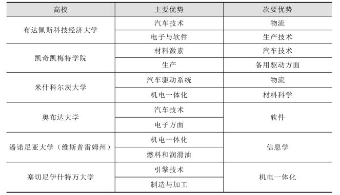 在汽车设计资质及创新方面表现活跃的高等教育机构已根据其各自的地区优势和企业能力来划分了相关的任务工作。而各大院校均将主要精力集中在了与相关公司联合开发的知识库上(见表4 - 27)。因此,杰尔本地大学主攻的是内燃机方面的研究,维斯普雷姆州的潘诺尼亚大学主攻的是燃料与润滑油,布达佩斯科技经济大学专注于电子与机电一体化方面,米什科尔茨大学专注于传动系统,而凯奇凯梅特学院研究的是材料科学和汽车装配。