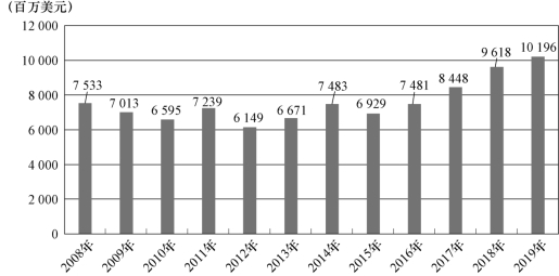 除了世界遗产之外,匈牙利还有9处国家公园,分别是:多瑙依波伊、费尔德—豪沙格、上巴拉顿、多瑙—德拉瓦、基什库恩沙格、格勒什—毛洛。独特的自然风光和人文景观使匈牙利成为旅游大国,也使旅游业成为匈牙利重要的外汇来源之一。2008—2019年匈牙利旅游业收入如图6 - 3所示。