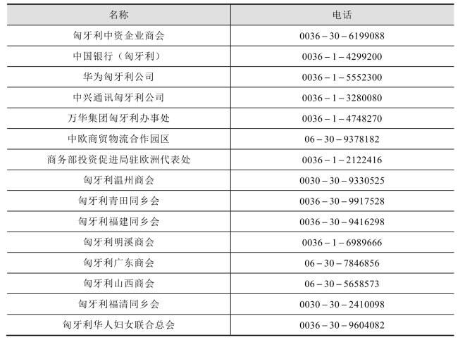 匈牙利中资企业商会、主要中资企业和华人社团联系方式见下表: