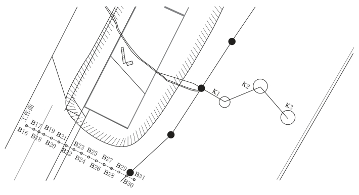 按理论应布置在工作面内大于距离开切眼301m以外(A21号点),但由于受工作面上方地形的限制,为方便测量以及能够测到更加真实客观的地表移动变形数据,将B线分两段布设,B1~B15号点布设在工作面内左侧距离开切眼390m处(A24号点),B16~B31号点布设在工作面内右侧距离开切眼700m处(B18号点)。