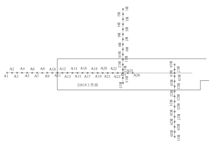 根据22618工作面实际地质采矿条件,A线和B线观测站编号和设计位置示意图如图2.1所示。