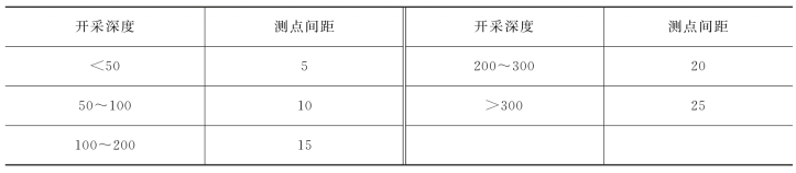 《建筑物、水体、铁路及主要井巷煤柱留设与压煤开采规范》(安监总煤装〔2017〕66号)给出的测点间距与开采深度的关系见表2.4。依据表2.4的建议值和矿区实际情况,本设计点间距取30m,地表移动观测站相关设计参数详见表2.5。