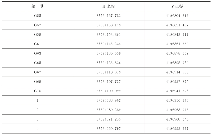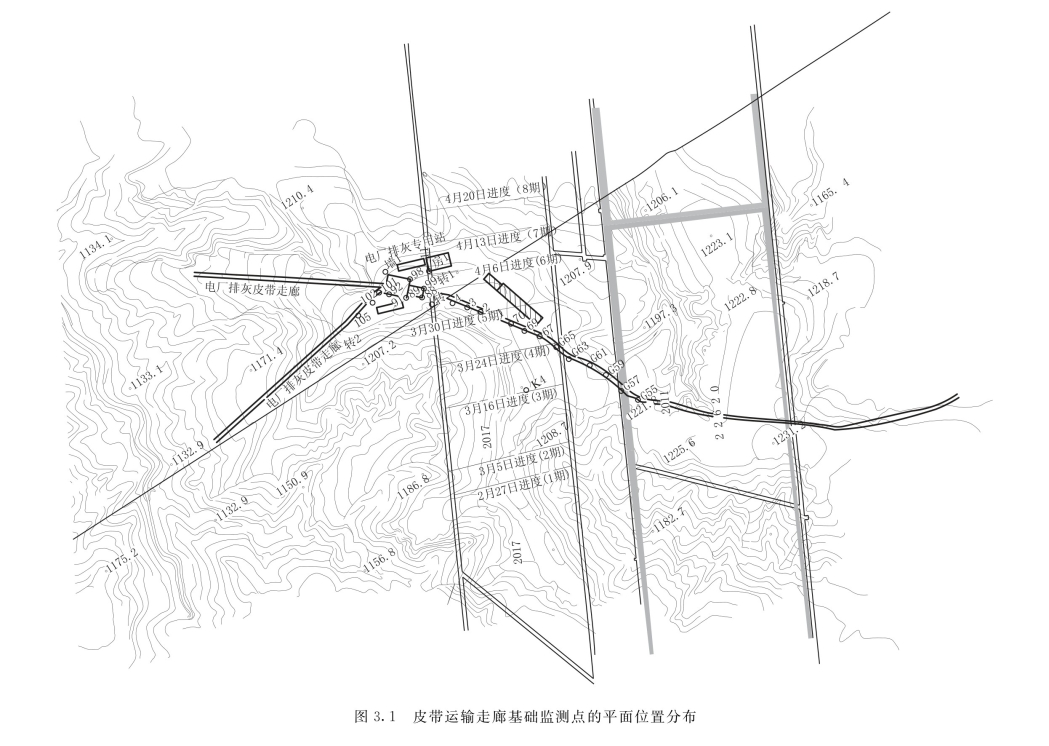 为监测皮带运输走廊基础的移动变形,在其基础上共设计了13个监测点,各点坐标见表3.2。皮带运输走廊基础监测点的平面位置分布如图3.1所示。