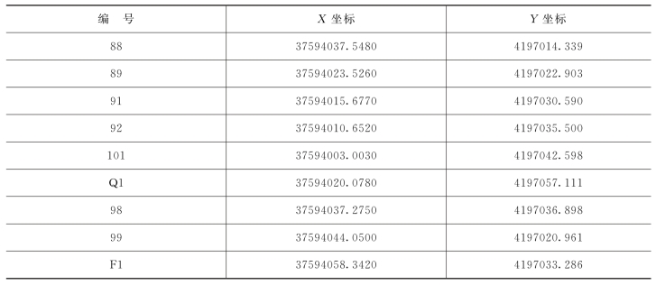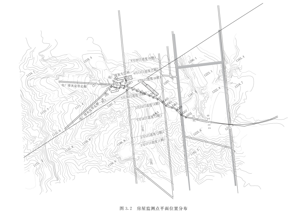 为监测皮带头机房的采动损害,在机房的基础上共设置了9个监测点,其坐标及与房屋的平面位置关系分别如图3.2和表3.3所示。