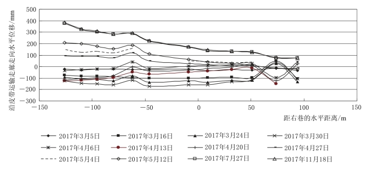 图5.6 沿胶带运输走廊走向监测点各期水平位移曲线