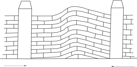 不均衡的水平位移将造成一定的水平变形,水平变形有正负之分,正值表示拉伸变形,负值表示压缩变形。地表水平变形对长度较大的建(构)筑物破坏作用很大,尤其是拉伸变形的影响。由于建(构)筑物抵抗拉伸能力远小于抵抗压缩的能力,所以较小的地表拉伸变形就能使建筑物产生开裂性裂缝。但当压缩变形较大时,建(构)筑物将产生严重的破坏,可使建(构)筑物墙壁、地基压碎,地板鼓起产生剪切和挤压裂缝,纵墙或围墙产生褶曲或屋顶鼓起,如图5.5所示。