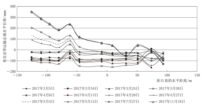 图5.6为沿胶带运输走廊走向监测点各期水平位移情况。由图可知,截止到2017年11月18日,地表水平位移已基本稳定,最大水平位移为4号监测点,位于22618工作面左巷上方地表内侧14m处,达383mm,位于22618工作面的拉伸区;从2017年3月5日—4月20日,胶带基础监测点的水平位移基本上都是向左的;监测点沿胶带走向水平移动自2017年4月27日以后(工作面开采过胶带150m),均沿胶带方向向右位移,之前均沿胶带方向向左移动。以上表明,在沿胶带运输走廊方向上,地表移动初期,地形对地表移动变形的影响较大,后期采矿对地表移动变形的影响较大。