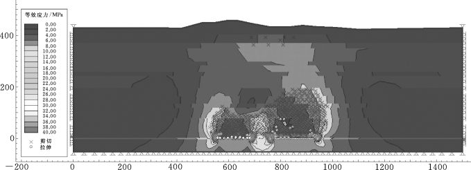 图6.15为22618工作面和22610工作面开采共同作用下,沿皮带运输走廊走向剖面覆岩与地表等效应力和破坏场发育情况。可以看出,22618工作面和22620工作面各自形成的等效应力拱在裂隙带和冒落带内并未联成一体,由于22620工作面的宽度较22618工作面的开采宽度大,22620工作面采空区上方的等效应力发育高度也较22618工作面高,说明22620工作面的破坏范围和程度比22618大,实际上从覆岩的破坏场发育情况也证实了该点,主要破坏形式为剪切破坏。其主要分布在等效应力包围的区域内。地表未发生明显的剪切或拉伸破坏。
