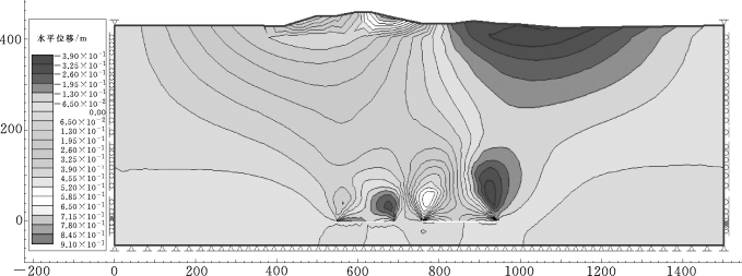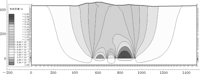 图6.16为22618和22620工作面开采共同作用下,沿皮带运输走廊走向剖面覆岩与地表垂向位移发育的情况。由图6.16可知,地表最大垂向位移为1535mm,发生在两工作面间煤柱右侧上方地表,与实测数据基本一致,比单采22618工作面地表下沉值大20mm。其主要原因如下:①22620工作面的开采宽度较22618大,且22618工作面的开采对22620来说是重复采动;②22618工作面上方地表较22620工作面上方地表高,在工作面上方形成了一个小边坡,在采煤和多重因素影响下,容易发生滑移。