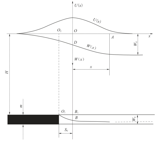 如图7.4所示,根据半无限开采的实测下沉曲线W(x)可确定W(x)的拐点D,将该拐点投影到计算边界B 1上求得开采边界和预计边界之间的长度S 0。根据S 0与采空区在水平投影的位置判断S 0取值的正负。如果两者在水平面上的投影是包含关系则S 0为正值,如果两者在水平面上的投影是相离关系则S 0为负值。