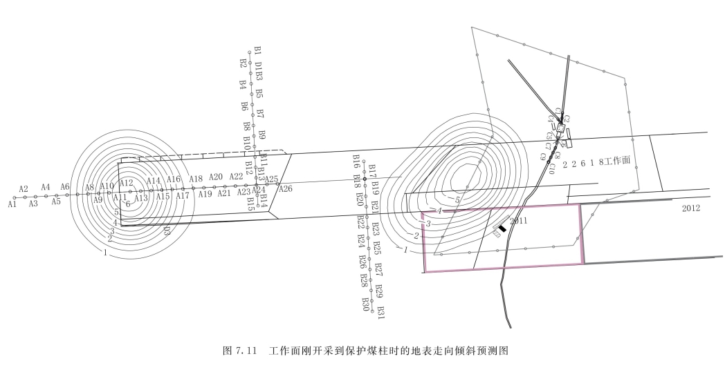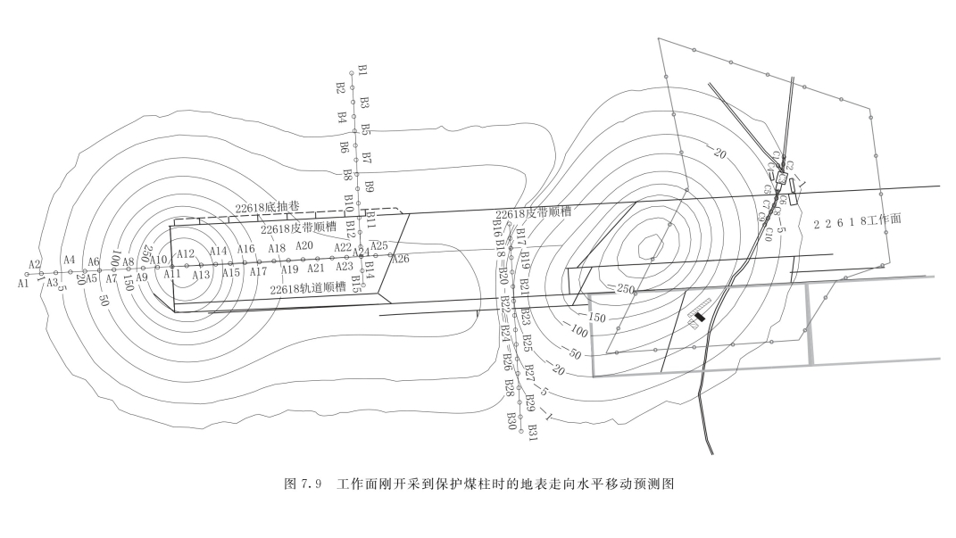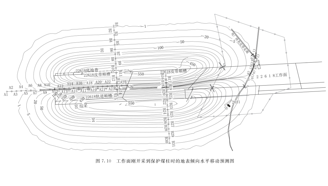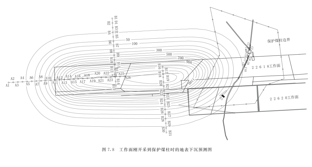 从预测结果来看,工作面刚开采到保护煤柱时,皮带处地表遭受最大下沉为30mm左右,位于22620工作面上方;皮带头机房未遭受下沉影响;22618工作面临22620工作面一侧皮带下方有约50mm长的地表遭受10~20mm下沉;地表最大下沉1500mm,主要分布于采宽180m时的工作面中央,比实测结果略大,这是因为地表下沉还没有达到最终稳定。具体情况如图7.8所示。