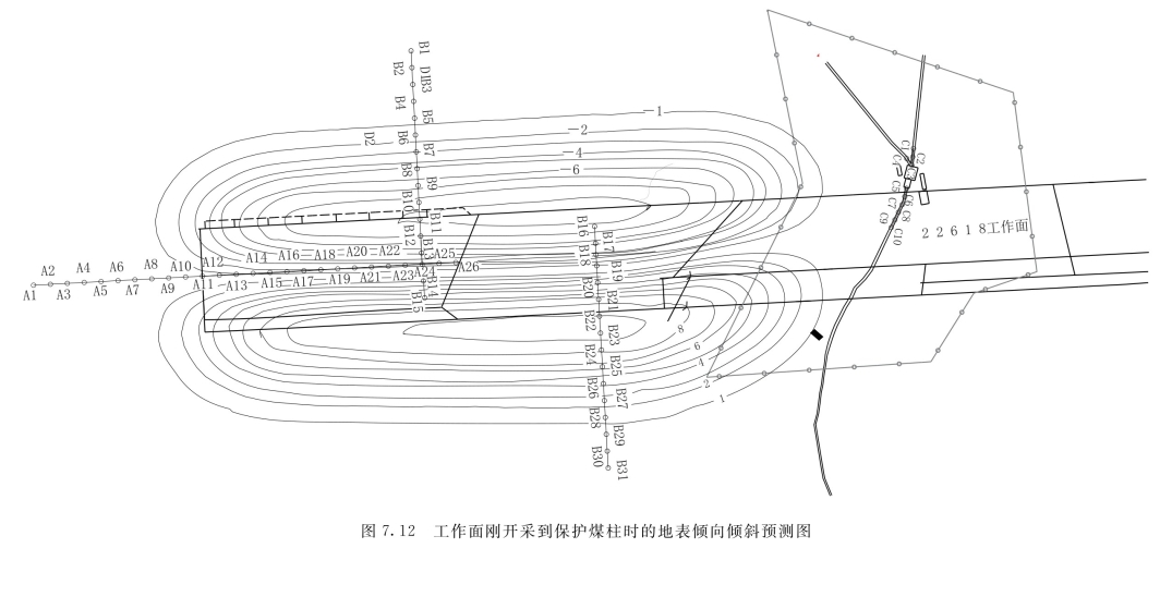 地表曲率也未波及到皮带运输走廊及皮带头机房。走向方向位于开切眼一侧的最大正、负曲率均为0.04mm/m2,最大正曲率位于开切眼外侧,最大负曲率位于开切眼内侧;走向方向位于保护煤柱线一侧的最大正曲率为0.04mm/m2,位于保护煤柱线外侧,最大负曲率为-0.03mm/m2,位于保护煤柱线外侧;倾向方向最大正、负倾曲率均达到了0.09mm/m2,均位于工作面两侧巷道上方外侧。具体情况如图7.13、图7.14所示。