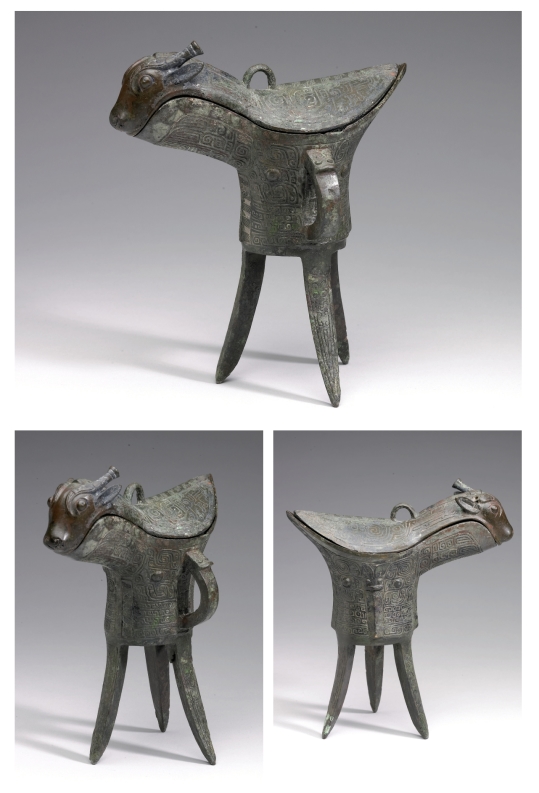 酒器。高22.6厘米。前流后尾有盖平底无柱“角”。全身满装密集细线浅浮雕兽面纹,器腹中间上有浮雕兽首,口下吐出长条状如兽“舌”,上饰有细钩纹排列。此舌形且见于器腹两面交接处的两端。器盖前有高浮雕叶形耳兽首,耳上满装纹饰,亦为细线浅浮雕的云雷纹,中间有近似“兽舌”装饰,中间有一环钮,便于提举。器上有兽首,鋬阴与盖腹内有铭文三字,乃亚丑族祭祀父丙者。可见古人对酒文化的重视以及饮酒风气的盛行。