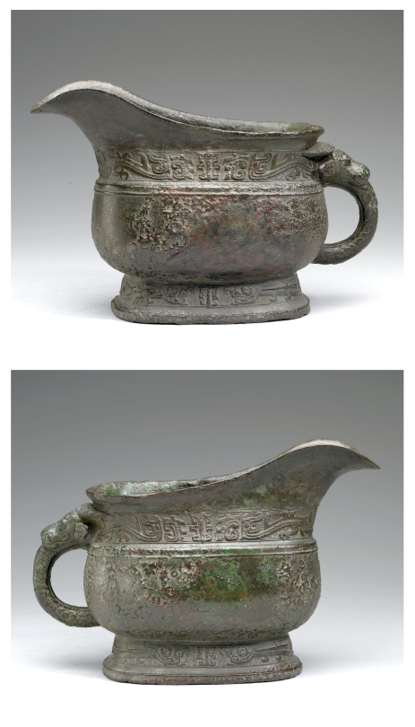 觥,全器做方形,四角稍方,流口、束颈、垂腹、圈足、弯把,把作兽首形。颈部与圈足饰顾首夔纹,以雷纹为地。在古代,青铜器作为盛东西的食器或酒器外,还是贵族进行筵飨、祭祀等礼制活动的重要礼器。青铜器在日常生活与仪式活动中没有特别明显的分别。《战国策·中山策》中有“饮食餔馈”的说法。古人祭祀的礼制活动与日常饮食是杂糅在一起的。