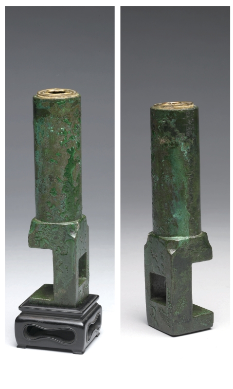 铜帐构铜绿色铜质,下半部为圆筒状,外侧刻铭一行二十字,清宫将其倒置增附铜胆,上半部则有方形镂空,似可供接合卡榫之用,或是大型物间中的一个组件。附木座,上铭文“乾隆御玩”“汉帐构”,由此可知这是当时汉代贵族居家、旅游、打仗必备之良品。