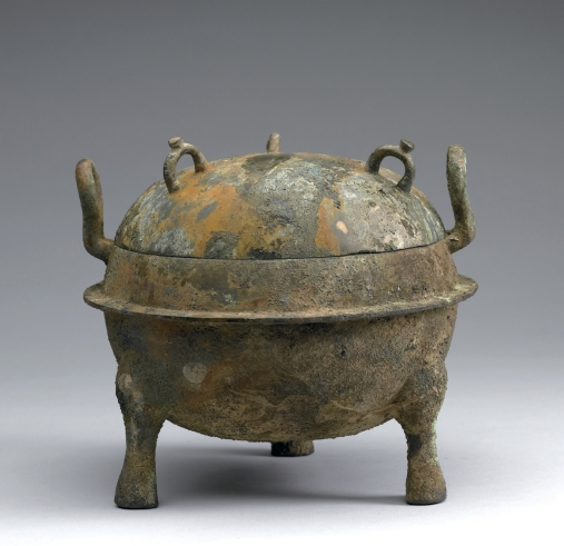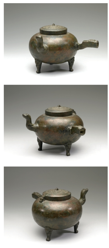 鐎,附钮盖、斜肩、兽形流、圆腹、弯把、兽形足,盖与器身以卡榫相接,把作兽首形。器盖饰蟠螭纹。古人喜饮温酒,“鐎”即是一种汉代常用的温酒器具。其特征为侧边的长柄,可持之置于炉上,用以加热酒浆。