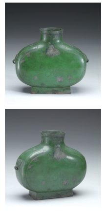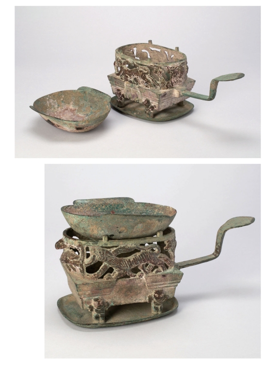用作加热肉类的容器。容器上四个方向铸有动物,即东方的绿龙,西方的白虎,北方的黑武士(乌龟和蛇)以及南方的红鸟。