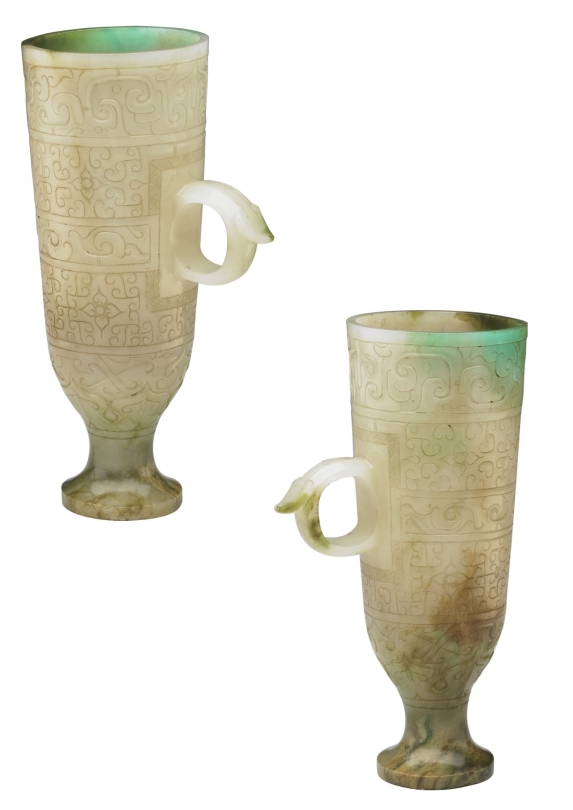 高12.3厘米。是古代用来饮酒的酒杯,杯体略呈细长的圆锥体,有高足与单柄。自口缘至高足上,以五条横饰带围绕器表,饰带中浅浮雕各式云纹、四瓣叶纹。口缘处、柄之外侧、高足至器腹下端,都因接触铜锈,而染成绿沁。其中口缘处的沁色,绿中带蓝,青白有铜绿泌。高脚杯形。