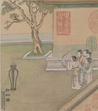 射粉团 题:“唐宫中造粉团角黍饤盘中,以小弓射之,中者得食。”