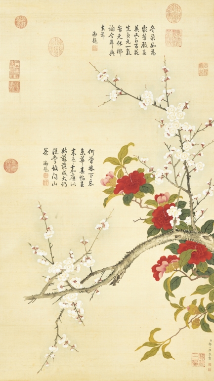 如意耳瓷器扁壶创烧于明代永乐年间,器形来源受到伊斯兰陶器及玻璃器影响,宣德时期持续烧造,目前可见白釉以及青花两种。其中青花可见以花卉、花鸟、花果以及人物图作为装饰者。这件扁壶有小口,细颈,腹部扁圆,平底无足,颈部两侧各有一耳连接颈部和肩部,器腹中央可以见到一道明显接痕。全器以青花为饰,颈部画转枝花卉,肩部饰蕉叶纹一周,蕉叶两旁略有晕染,腹部两面各有一株盛开的山茶。器底露胎,呈白色。无款。