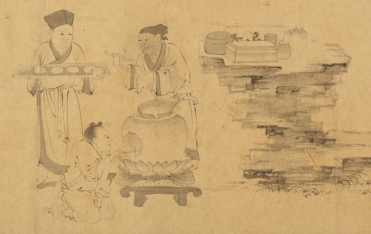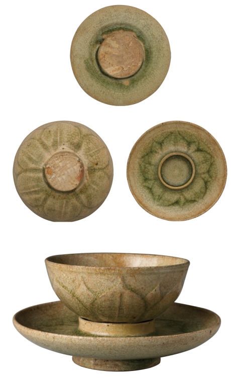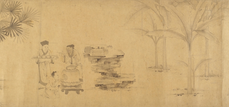 旧传李公麟绘。图为东晋高僧释慧远在庐山东林寺与当时的名流结“白莲社” 的情景。我们特从中取出喝茶的场景,与南朝流传下的茶具实物相互印证,从图中可以看出,茶碗无托,但碗形有所相似。不过,此图是明代人所绘,茶器有所偏差,亦是常理。