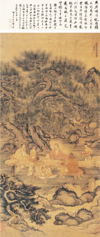 151.5厘米。图中一僧四士在喝茶聊天,一童子立于旁边侍茶,另一童子正端茶而来。主人(陈老莲)正在给客人酌茶。图画中的茶盏均无托。