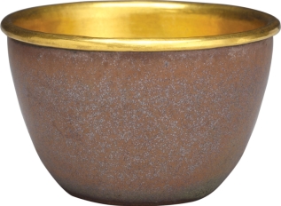 胎地为宜兴紫砂,外壁施紫金釉,烧成后,再于杯内套金片至杯口,非常漂亮。