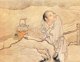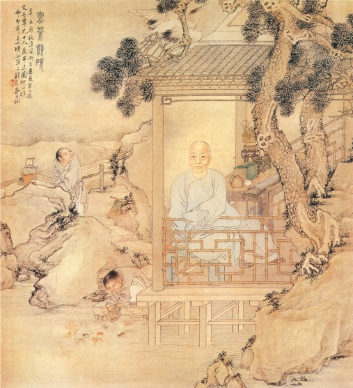 同治十年(1871年),钱慧安为友人文舟作肖像画,即为此图。画中有两株虬曲松树,一座傍石水榭,另有一中年男子倚栏而坐。榭内琴桌上置有茶具、书函,一侍童在水边涤砚,数条金鱼正游向砚前;另一侍童拿着蒲扇,对小炉扇风烹茶。