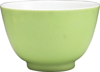 此色在民间称为“吹绿”,原因是以吹釉技法制成,即用竹筒一节,一端蒙以细纱,蘸釉浆后,于另一端用口吹釉于坯面,反复喷吹使坯表施一层厚度均匀的釉。吹绿色是雍正朝低温珐琅绿釉的代表釉色,因其釉色极难控制,所以大多有色差。