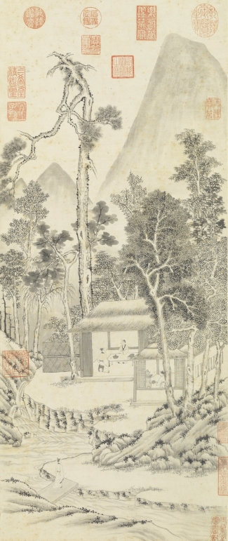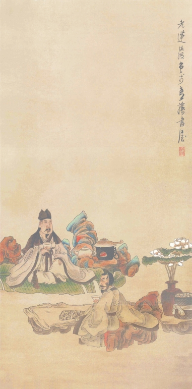 此画又称《停琴啜茗图》。图中主人(疑为陈老莲自画像)正在与客人品茶,旁边置茶炉壶具。