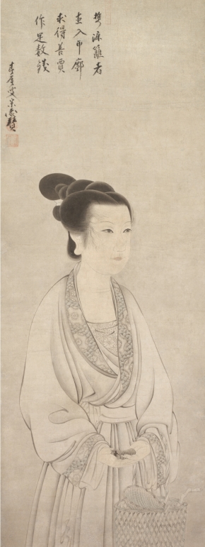 97.6厘米×37.2厘米。唐代禅门居士庞蕴的女儿。庞蕴被誉称为达摩东来开立禅宗之后“白衣居士第一人”,素有“东土维摩”之称。据传,庞蕴与家人谈到学佛的难易,庞灵昭答:“也不难,也不易,饥来吃饭困来眠。”