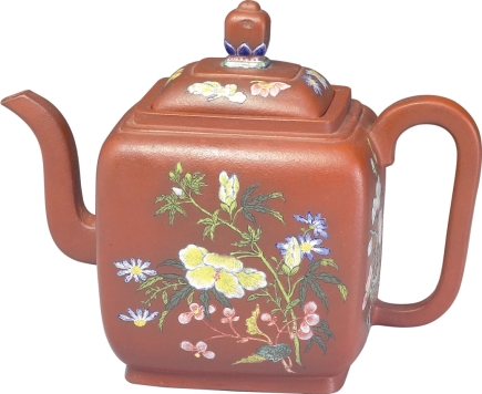 通盖高11.6厘米。壶底书“康熙御制”。此方形壶釉彩鲜丽,画工精巧,为清代宫廷极为珍稀的御用茶器。
